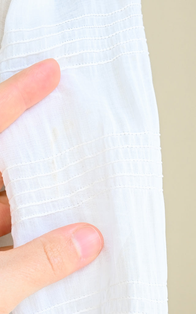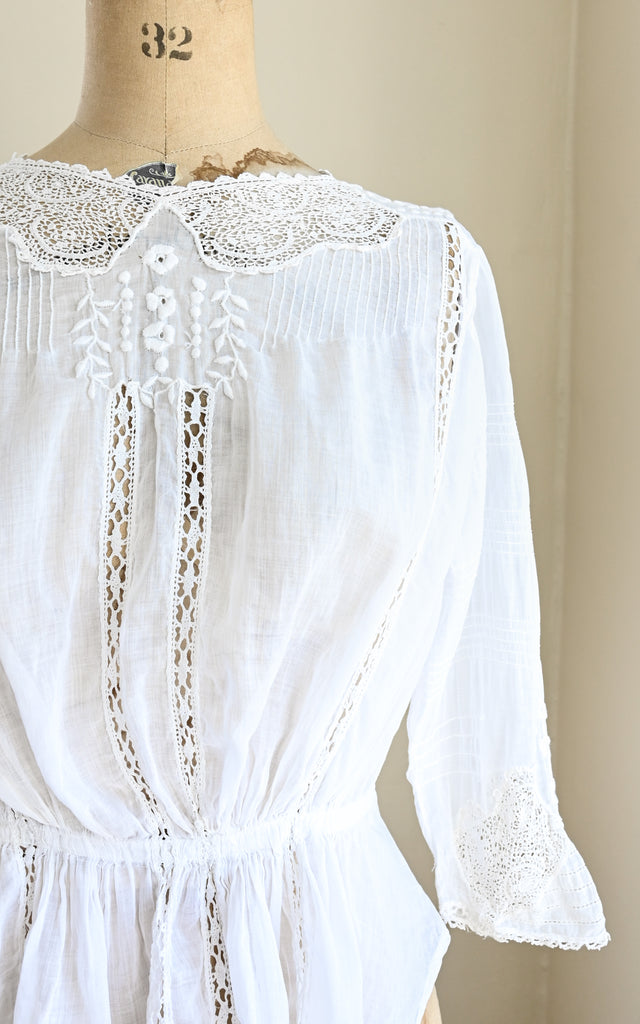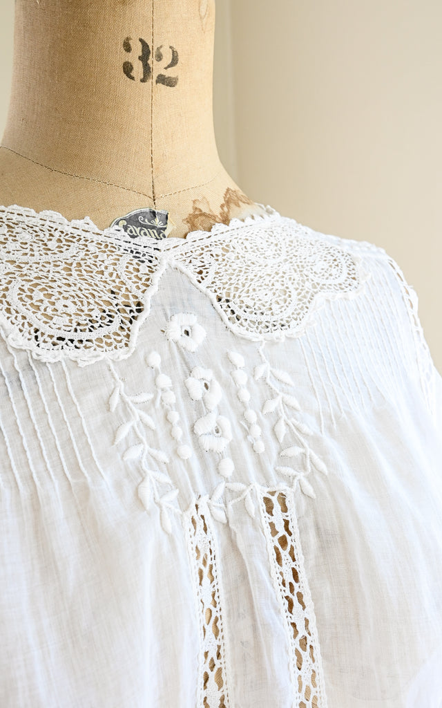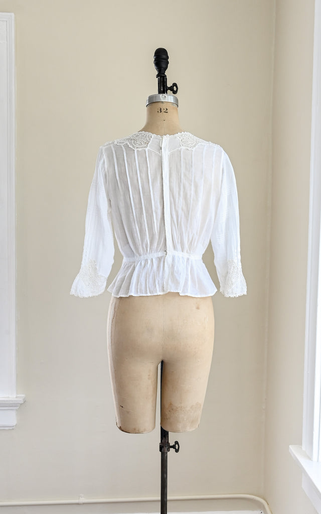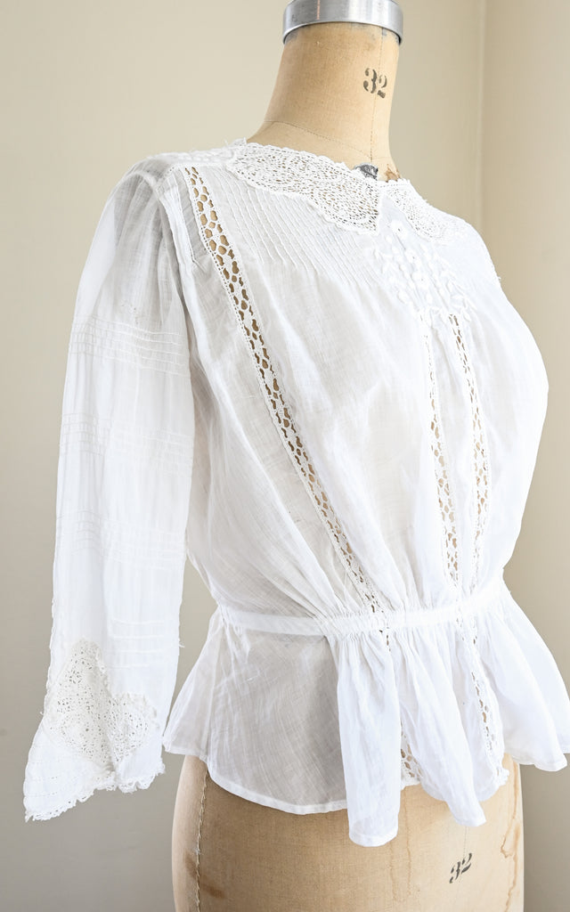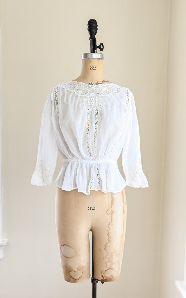 Antique 1910s cotton blouse with crochet faux collar, pin tucks, embroidered detail and peplum.