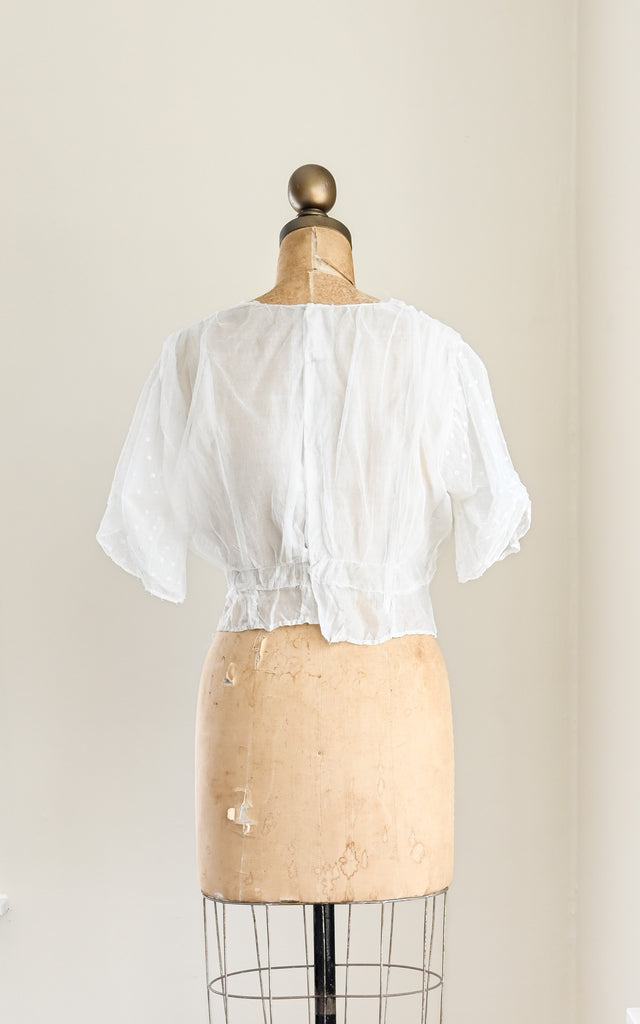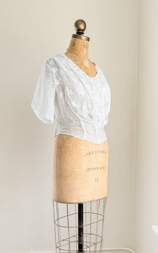 Antique 1910s mesh and lace blouse with short sleeves. Blouson style top lined in raw silk with fitted waist (meant to be tucked in). Baleine (whale bone) boning inside.