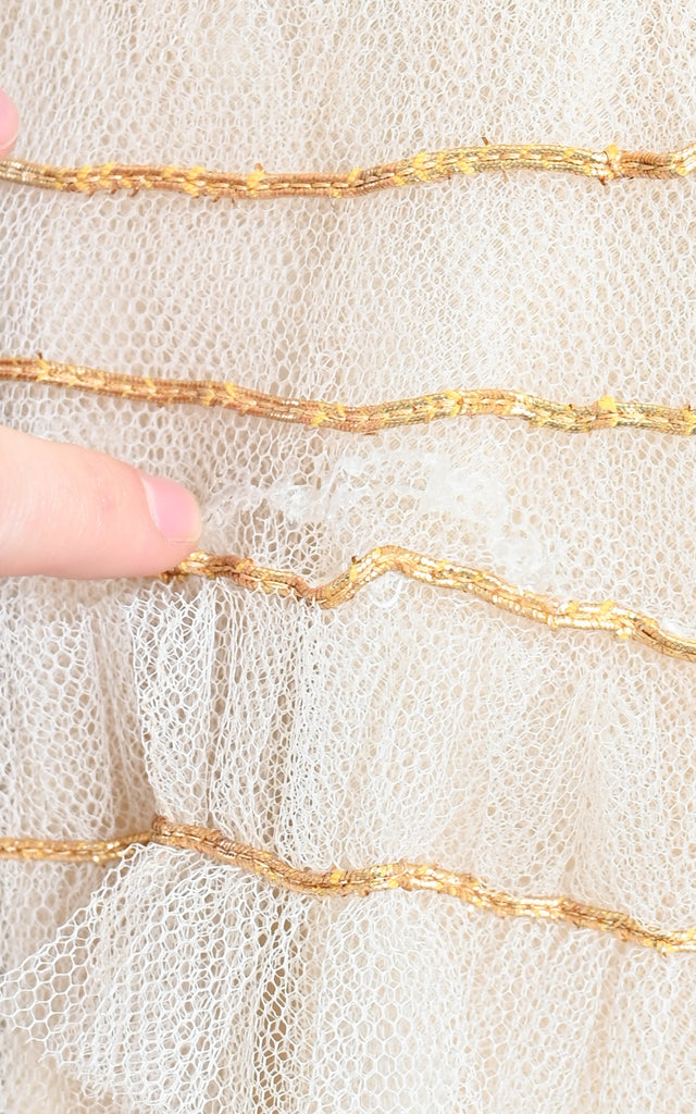 Lastly, the gold trim under the waistline has been reattached to the tulle with white thread, which is partially visible in small areas (see images). The dress presents well despite these flaws, and price has been adjusted accordingly.