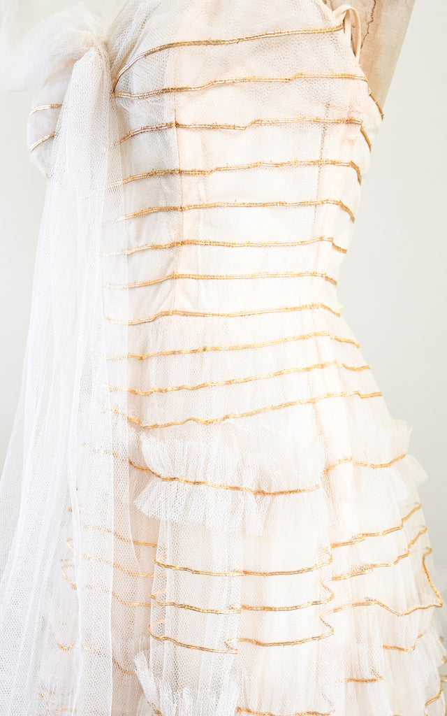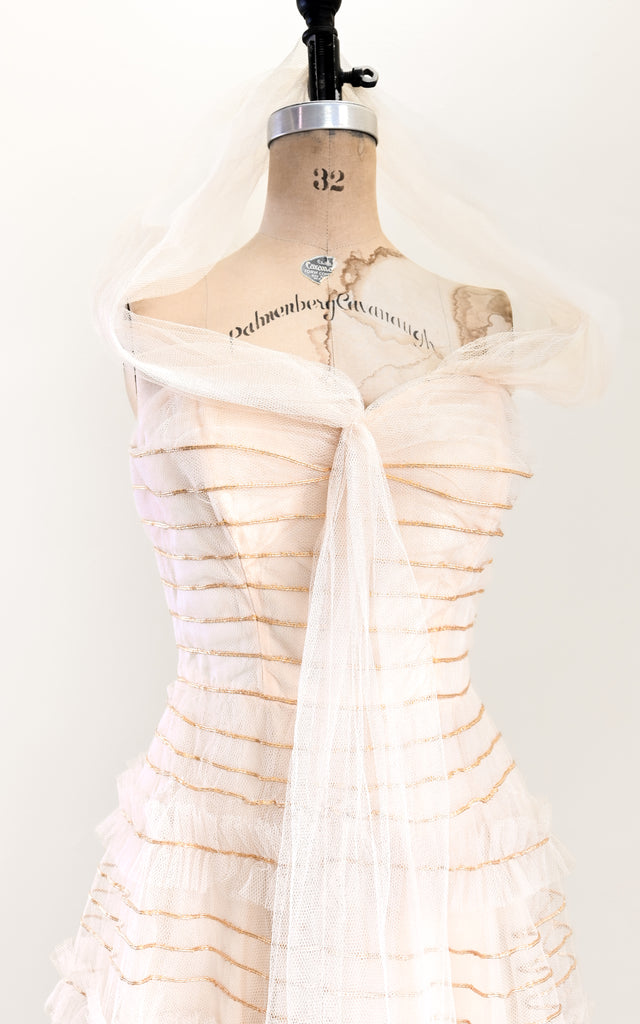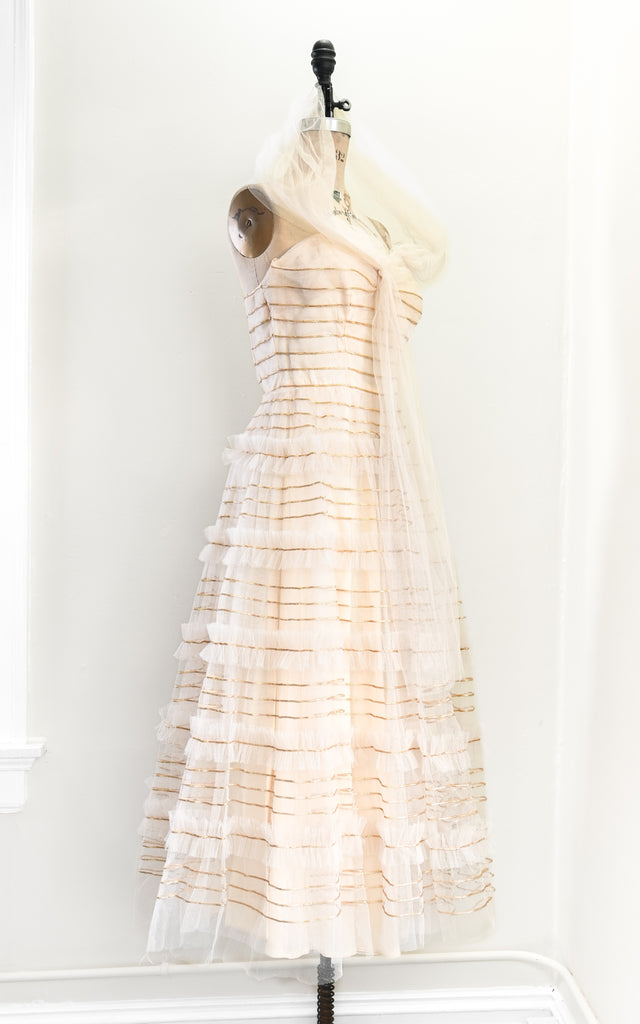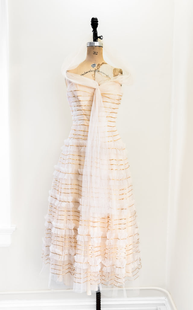 Vintage mid-century tulle midi gown with fitted, boned bodice and full skirt. Gold metallic trim creates horizontal stripes along with gathered tulle along the skirt. There is an attached decorative wrap the wraps around the neck and cascades down the front. Best worn with an additional petticoat to fill out the skirt. Would make a unique wedding dress!