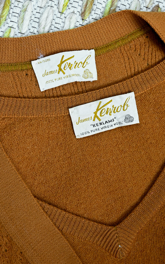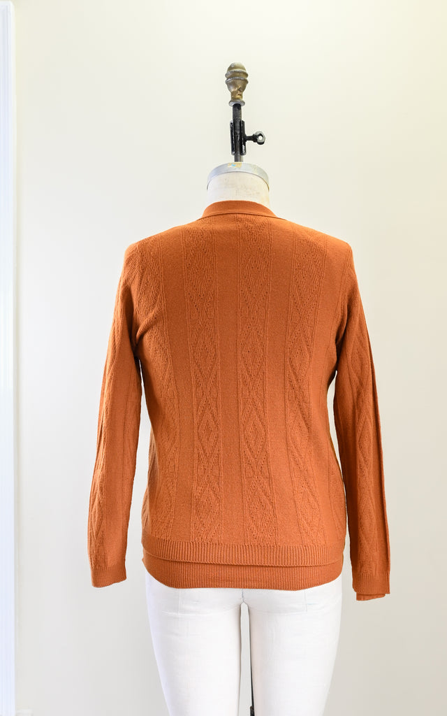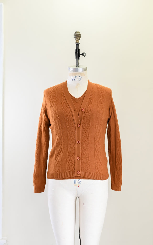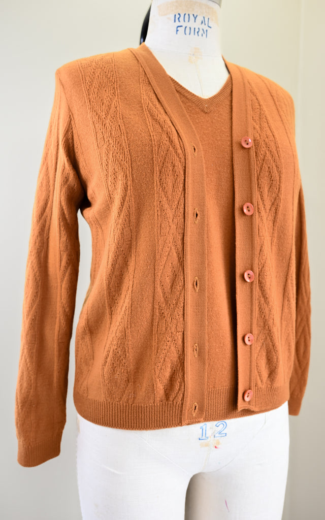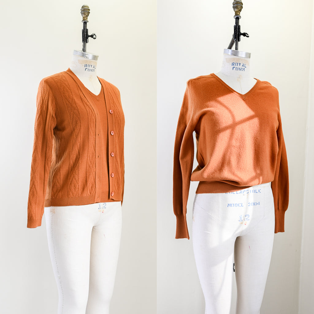 Vintage mid-century 2-piece sweater set made from a soft virgin wool. Comes with a v-neck long sleeve sweater and a matching cardigan.