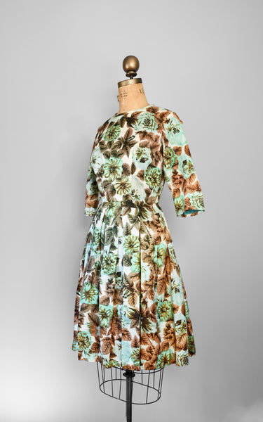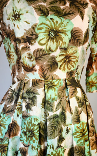 Vintage mid-century party dress with 3/4 sleeves and wide, flattering pleats.
