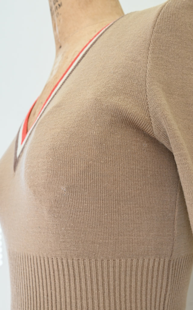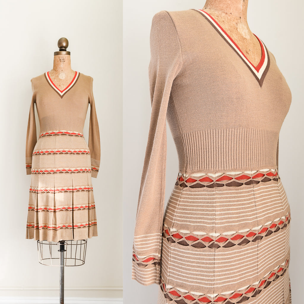 Vintage 1970s knit dress with v-neck, pleated skirt, and a lovely textured pattern.